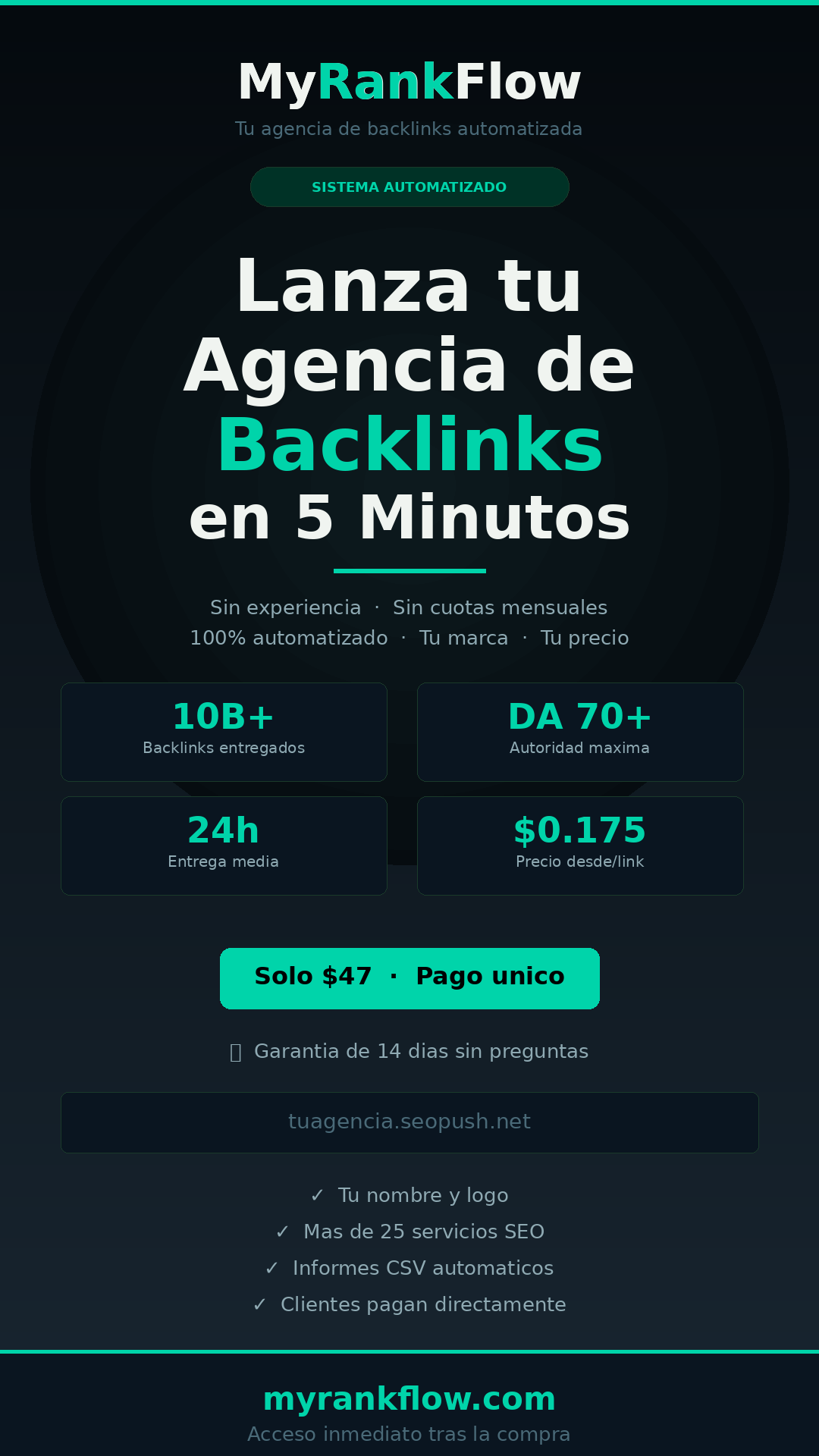 50% de comision en el panel de agencia. Producto evergreen que resuelve un problema real para cualquier emprendedor, freelancer o negocio local.